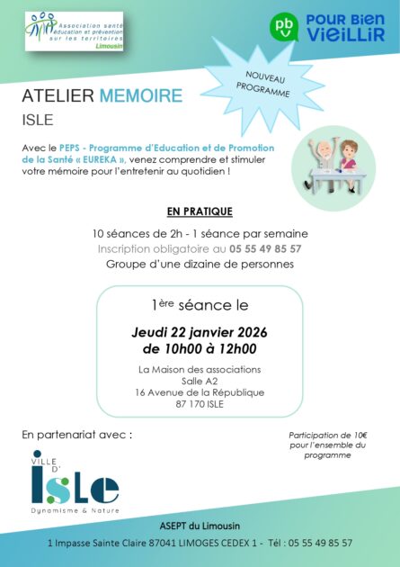 La Ville d’Isle s’associe à l’ASEPT du Limousin pour proposer trois cycles d’ateliers thématiques. Que vous souhaitiez stimuler votre mémoire, retrouver une vitalité physique ou équilibrer votre assiette, ces programmes sont conçus pour vous accompagner dans la convivialité.