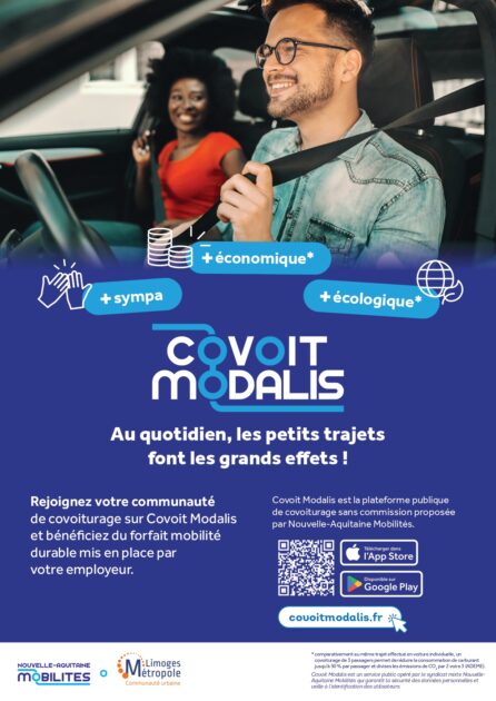 Limoges Métropole s’est rapprochée de Nouvelle-Aquitaine Mobilités (NAM) afin de proposer un service simple et efficace pour tous les habitants. Covoit Modalis est une plateforme de covoiturage sur laquelle les utilisateurs peuvent rechercher et proposer des trajets partagés de courte et moyenne distances pour organiser leurs mobilités du quotidien, par exemple entre leur domicile et leur lieu de travail ou encore pour leurs loisirs.